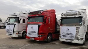Battaniye, su, bebek maması, çocuklar için süt, çocuk bezi, kışlık kıyafet, gıda ve temel yaşam malzemelerini içeren yardımları taşıyan TIR’lar Kobanî’ye 10 kilometrelik mesafede olan bir dinlenme tesisinde etrafları bariyerlerle kapatılmış durumda.