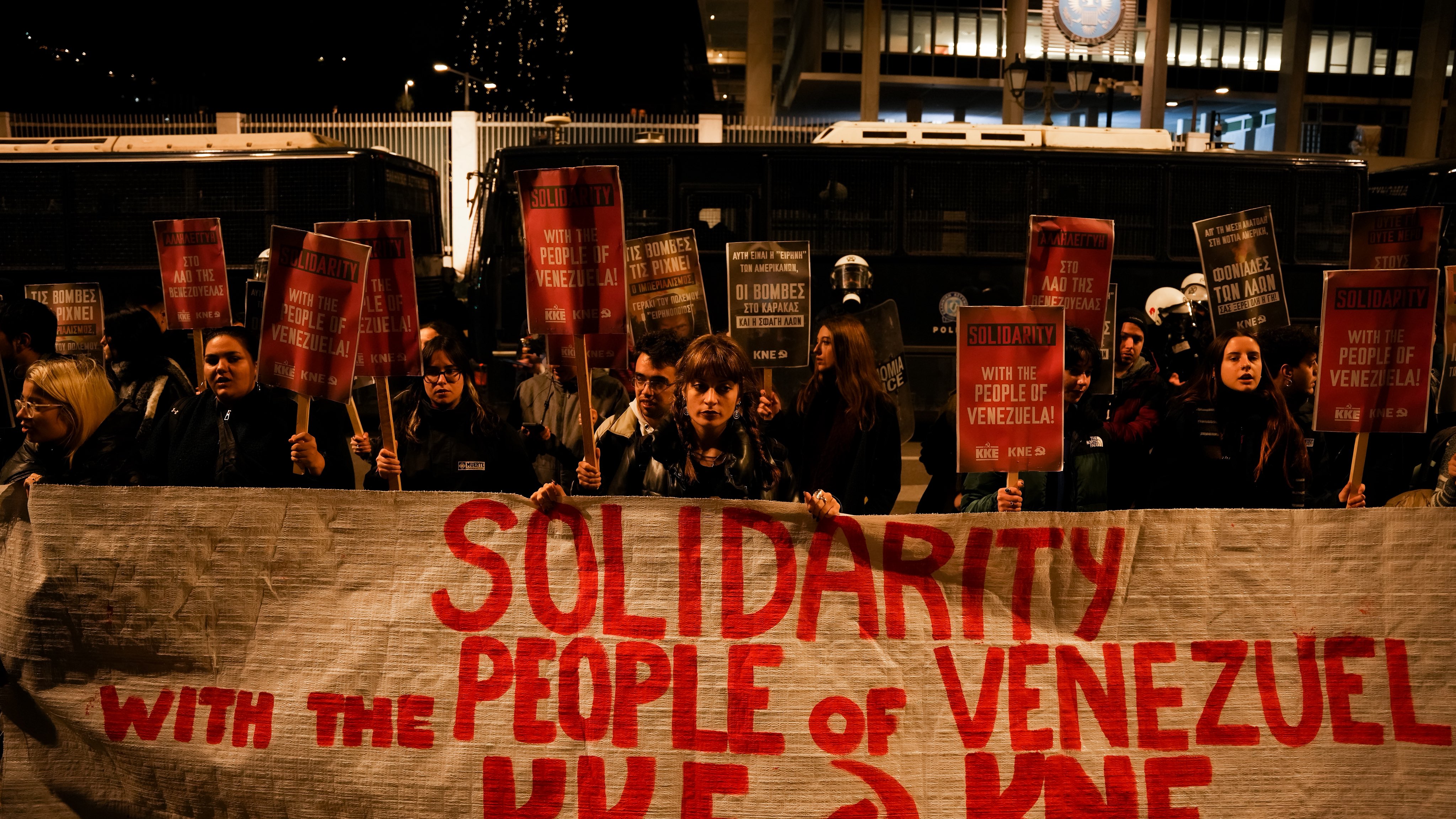 Yunanistan’ın başkenti Atina’da akşam saatlerinde ABD konsolosluğu önünde düzenlenen protesto gösterisinde ABD bayrağı ateşe verildi. Yunanistan Komünist Partisi’nin de (KKE) desteklediği eylemlerde, “Hepimiz Venezuela’yız” sloganları atıldı.