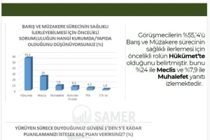 Görüşmecilerin yüzde 55’4’ü sürecin sağlık ilerlemesi için öncelikli rolün hükümette olduğunu belirtti. Bunu yüzde 24 ile “Meclis”, yüzde 7,9 ile “Muhalefet” yanıtı izledi.
