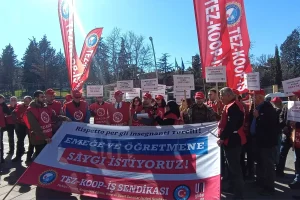 Tez-Koop-İş Sendikası, Özel İtalyan Lisesi’nde görev yapan 14 Türkiyeli öğretmenin grevi 22. gününde devam ediyor. Aynı okulda çalıştıkları İtalyan öğretmenlerin 350 bin TL kendilerinin ise 60 bin TL ücret aldığını açıklayan öğretmenler, çalışma koşulları ve sosyal haklar konusunda da ayrımcılık yapıldığını belirterek greve başladı. Öğretmenler eylemlerini geçtiğimiz hafta Ankara’da İtalyan Büyükelçiliği önüne taşıdı. Ayrımcılığa son verilmesini isteyen öğretmenler maaşlarının Türkiye’deki denk okullarda görev yapan öğretmenlerin düzeyine çekilmesini ve çalışma koşullarında ayrımcılığa son verilmesini istiyor.
