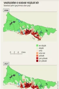 “2006’da İstanbul’un yüzde 9,12’si geçirimsiz yüzeyken, bu oran 2021’de yüzde 38 artarak 36 bin futbol sahası büyüklüğüne ulaştı. Yeraltı suyu beslenemiyor, yüzey akışı artıyor, sel riski geniş alanlara yayılıyor.”