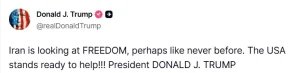 Truth Social hesabından bir paylaşım yapan Donald Trump, “İran, belki de hiç olmadığı kadar özgürlüğe bakıyor. ABD yardım etmeye hazır!!!” ifadelerini kullandı.