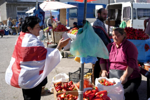 Omuzlarında kırmızı haçlı Gürcü bayrağı taşıyan anneler, çarşı pazar dolaşarak gazete dağıtıyor.